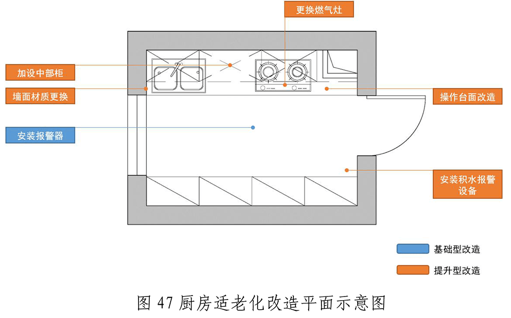 我国老年人口规模巨大。国家统计局数据显示,2022年我国60岁及以上人口约为2.8亿,占全国人口的19.8%。因此,《都市居家适老化革新指导手册》为都市居家适老化革新提供系统、简朴、可行的革新方案和技术路径,可有效资助老年人提高居家适老化革新意识,提升行业居家适老化革新技术水平。《都市居家适老化革新指导手册》中明确指出厨房革新有关燃气宁静的两点建议: