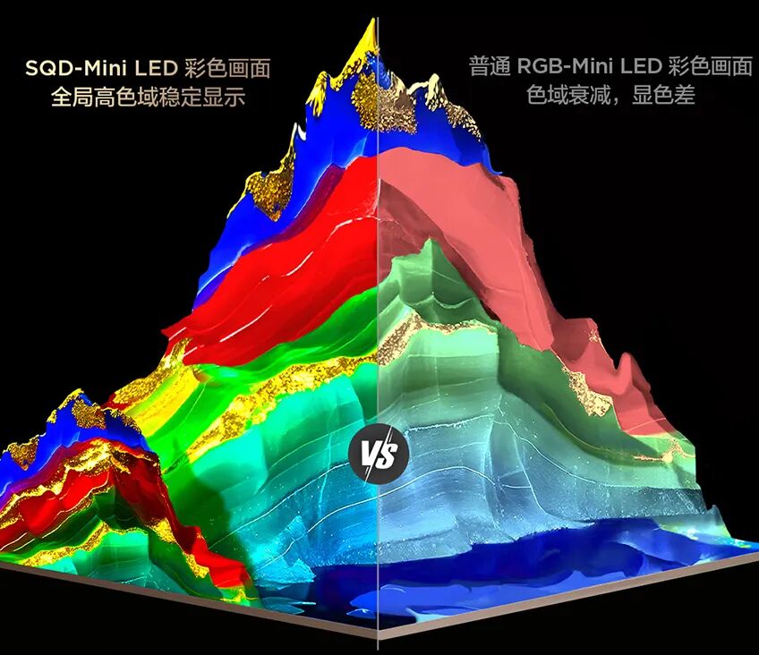 ¾ÝÖйú¼ÒµçÍø´ÓÐû²¼»áÉÏÏàʶÐÅÏ¢£¬ÓëRGB-Mini LEDÏà±È£¬SQD-Mini LED½ÓÄɵ¥À¶¹âLEDÒý·¢Á¿×ÓµãĤµÄ·¢¹â»úÖÆ£¬ÏȾÓÉÀú³Ì³¬¼¶Á¿×ӵ㽫À¶¹âת»¯Îªºì¡¢ÂÌ¡¢À¶´¿¾»ÈýÉ«£¬Ôٺϳɳ¬¼¶°×¹â;Ëæºó£¬³¬¼¶µûÒí»ªêׯÁµÄ¾§´â¸ßÉ«×èÖÊÁÏ»áÔٴιýÂËÔӹ⡢·ÅÐд¿¾»¹âÏß¡£Òªº¦ÓÚÔÚ£¬³¬¼¶Á¿×ÓµãµÄÉ«²É¹âÆ×Óë¾§´â¸ßÉ«×èµÄ´©Í¸¹âÆ×ʵÏÖÍêÉÆÖØºÏ£¬ÐÎ³É 1+1 2 µÄÐͬЧӦ£¬ÕâÒ»Éè¼ÆÊ¹ÆäÓÚµ¥É«Óë¶àÉ«³¡¾°Ï£¬¾ùÄÜÎȶ¨Êä³ö100% BT.2020È«¾Ö¸ßÉ«Óò£¬ÍêÈ«¶Å¾øRGB¼Ü¹¹ÒòÏàÁÚ¹âÇøÒçÉ«ÖÂʹµÄ ´®É« ÓëÉ«Óòµßô¤ÎÊÌâ¡£